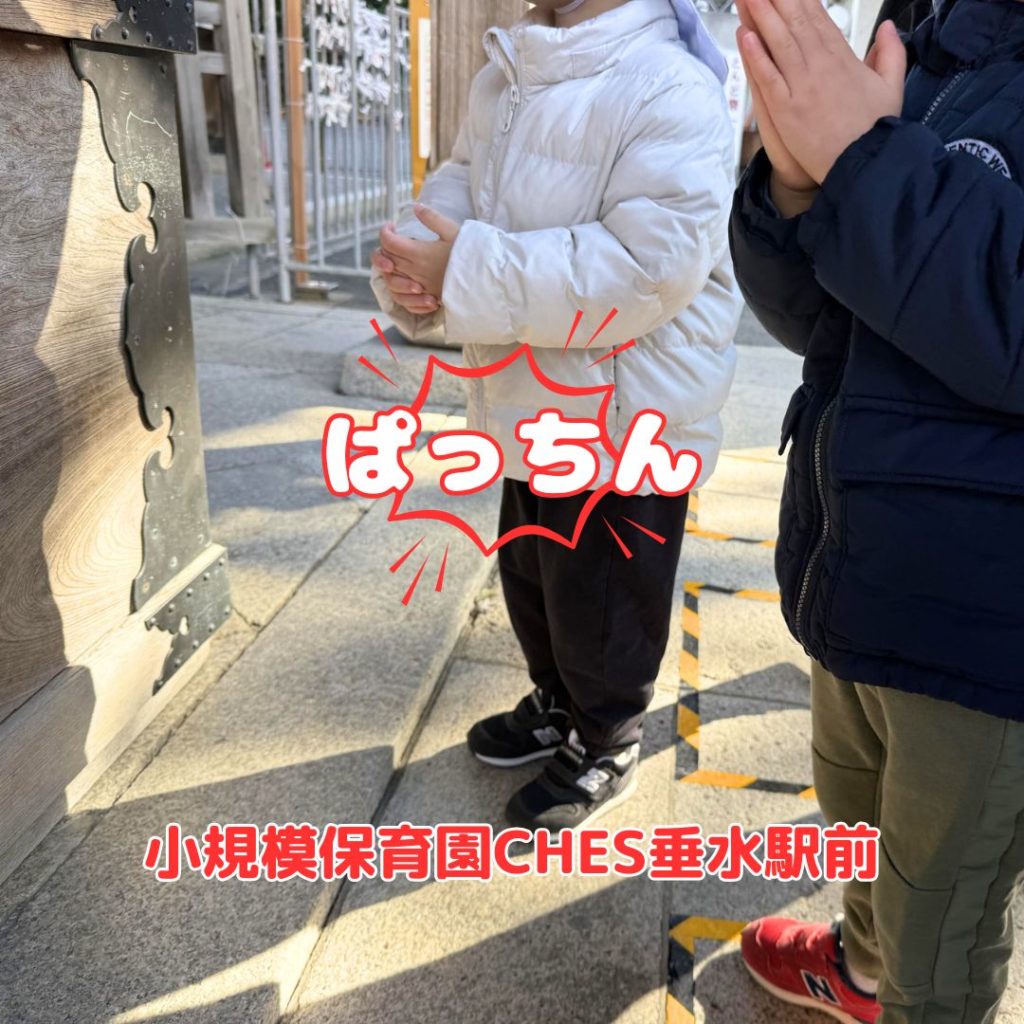 今週は年始の雰囲気を味わうために、子どもたちと近隣の神社まで初詣に行ってきました。神社につくとすでに多くの参拝者、子どもたちは人の多さにびっくりしていました。でも「みんなパッチン(手を合わせる)しにきたのかなあ?」と周りの様子を見ながらワクワクしている様子も見られました☺