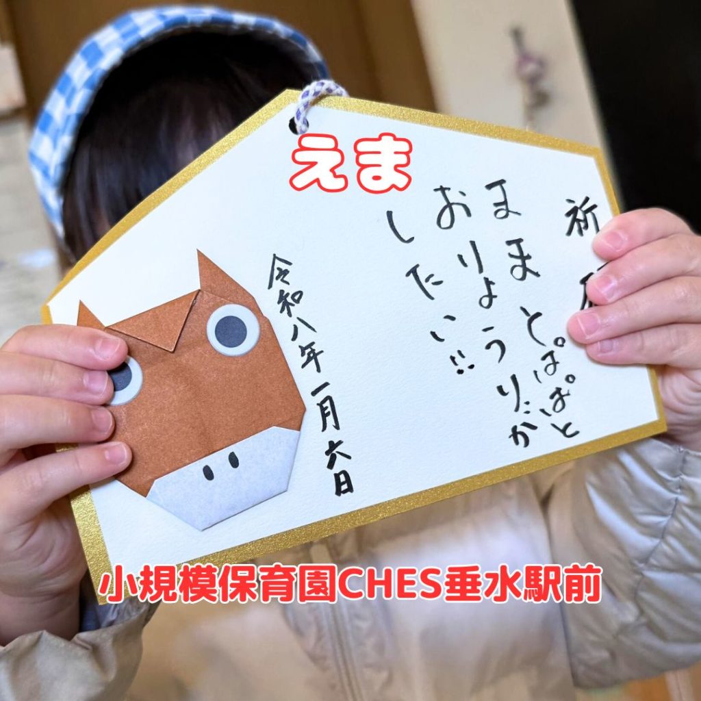 保育園に戻り、職員手作りの「絵馬」にもそれぞれのお願い事を職員と一緒に筆で書きました。降園時には保護者の方にも子どもたちのかわいいお願い事を見ていただくことができました。みんなの素敵なお願い事が無事叶いますように✨