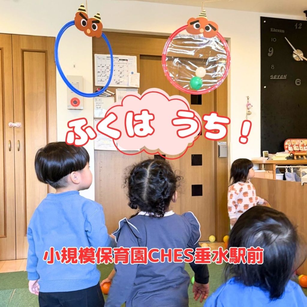 節分の日に向けて朝の会ではまめまき、おにのパンツの手遊び歌を歌ったり、おにの絵本を見たりしています。「保育園にもおにさんが来るかも?」と伝えると「怖い…」と怖がる子どもの様子も。しかしボール投げで「鬼は外!福は内!」と強い腕で力いっぱい投げておにさんをやっつける練習をしておこうと伝えると「よしっ」と前向きな姿も見られました!