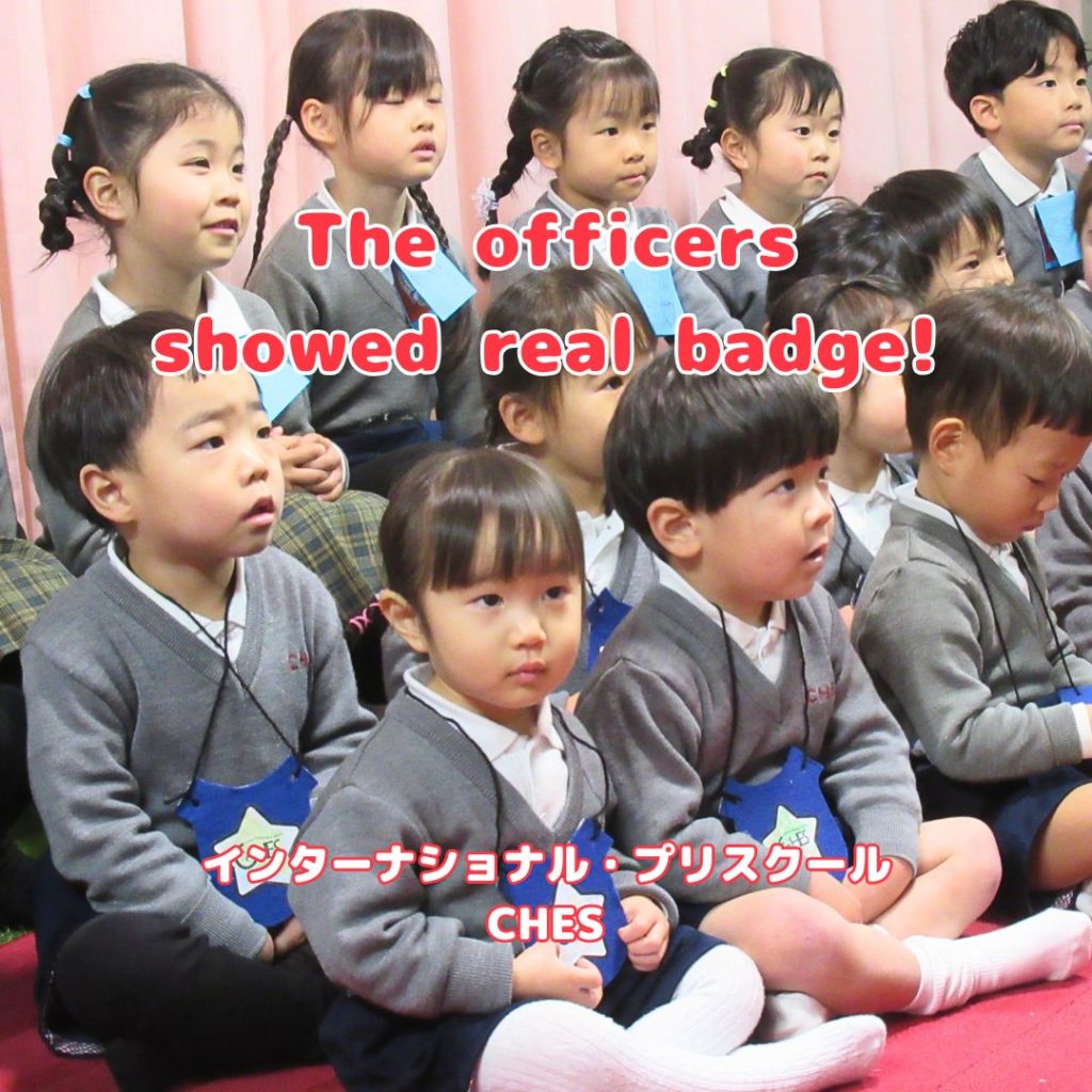 ここ数日は少し春の気配も感じるようになりましたね。2月にはいり「プリ・クラス」のTopicは「職業」に替わりました。この日のために各クラスではオリジナルの警察手帳やバッジをつくり楽しみにしていました。そこに颯爽と登場したのが本物の「警察官」。