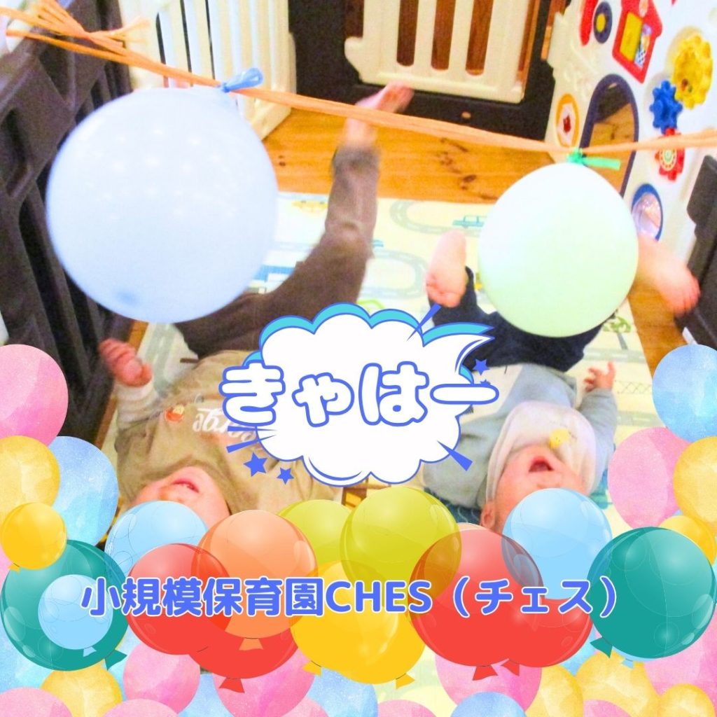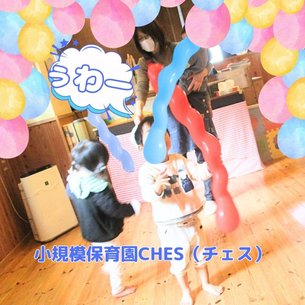 小規模保育園CHES(チェス)では、風船遊びを楽しむことに。ただいつもの風船だけではなく、今回はねじねじした長い風船を用意したり、マットに寝転がって足で蹴って遊ぶコーナーを作ったりして遊んでみました。