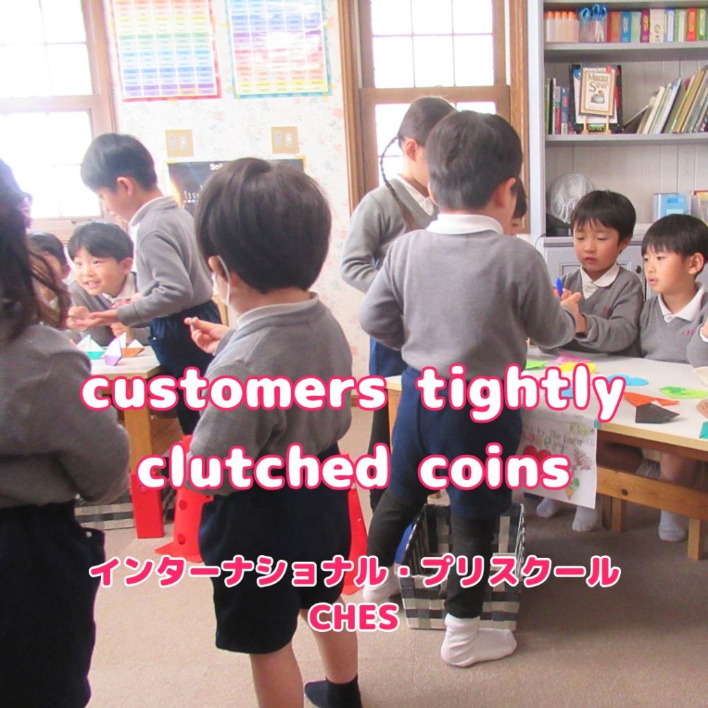各お店がお客様を誘う声をかけている中、お客様はあちらこちらのお店を見て回ります。最初は少し圧倒されていましたが、100円玉をしっかりと握りしめながら、Blue BirdとYellow Kangaroo(年少学齢以下)のお友だちは欲しいものを見つけることができました。