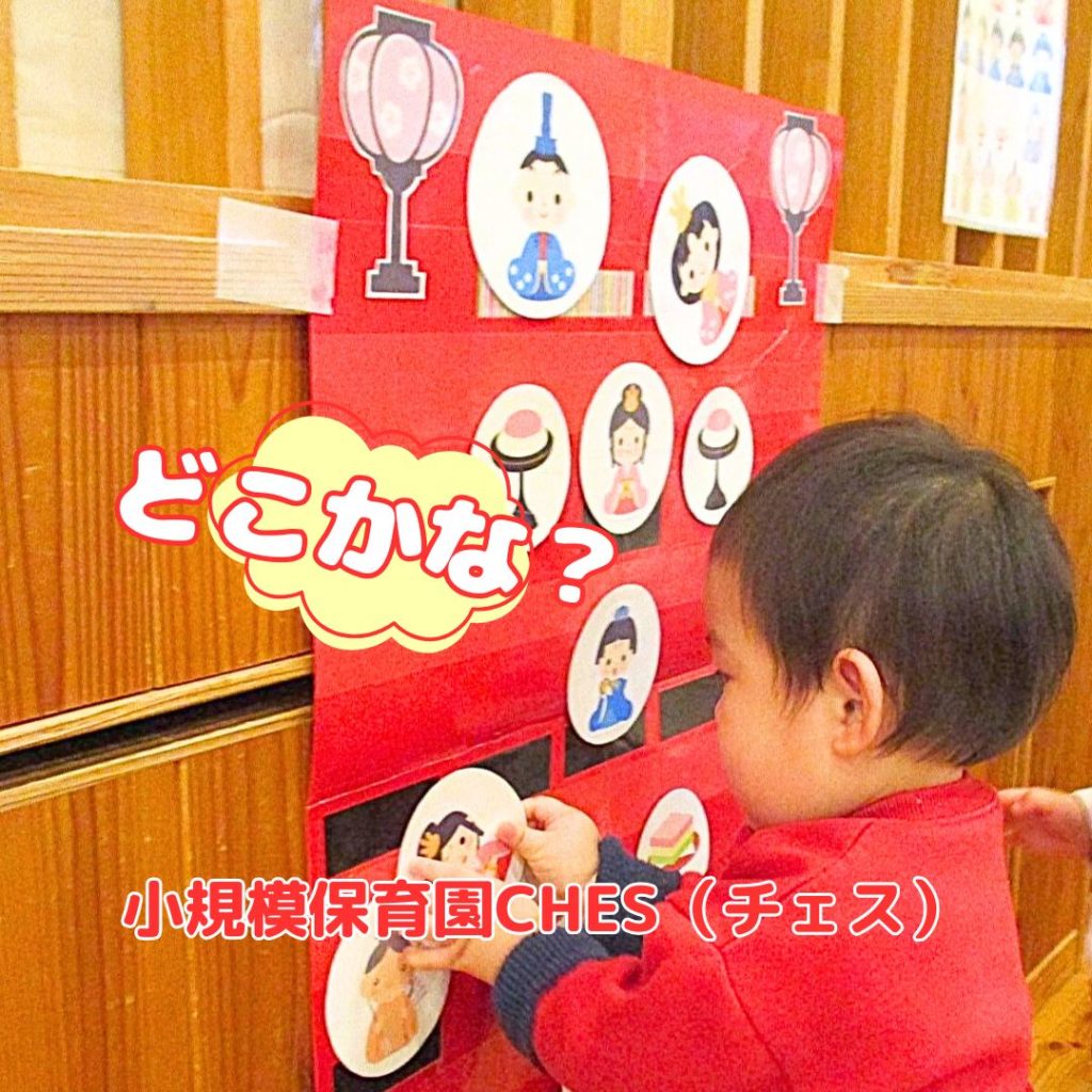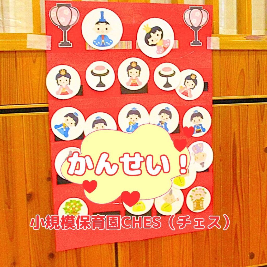 3月3日の桃の節句に、小規模保育園CHES(チェス)ではひなまつり会を行いました。お天気はあいにくの雨でしたが、子どもたちが製作したかわいいおひな様のおかげで、お部屋の中は華やかな雰囲気に包まれていました。