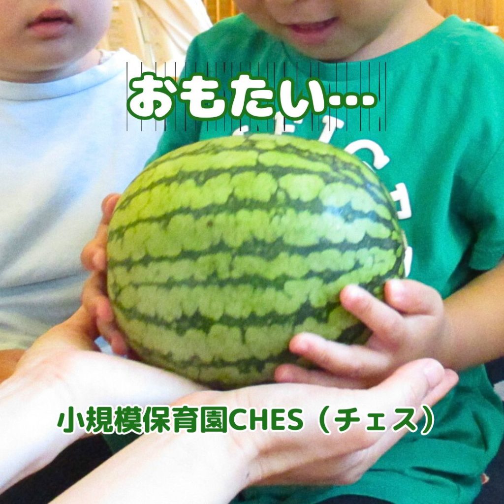 すいか割りをすることを伝えると「えっ! すいかわり🤩」と、小規模保育園CHES(チェス)の子どもたちの目がキラキラと輝きだしました。「すいかくんがね・・」の絵本を見て、すいか割りの勉強からスタートです♪
