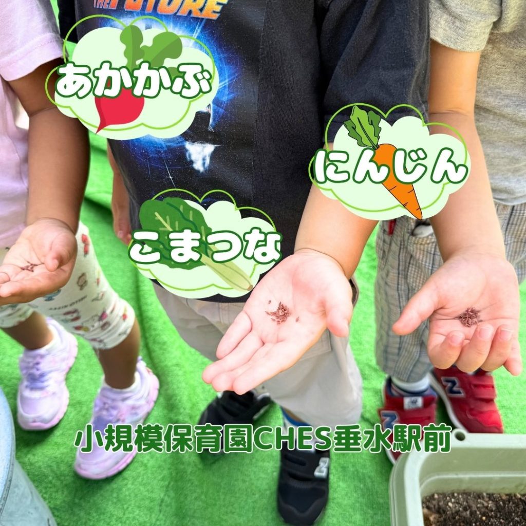 小規模保育園CHES垂水駅前では、夏野菜を育てた経験から、秋もみんなで野菜を育てることに決めました。秋に旬を迎える野菜の写真を子どもたちの前に並べて、どの野菜を育てたいか聞きいてみると、子どもたちが選んだのは…、「赤かぶ(ラディッシュ)」「小松菜」「ニンジン」でした!