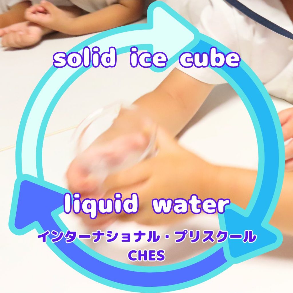 This change is what we were interested in. We learned three key words: solid, liquid, and gas. Matter is hard to understand, but these three we could actually see! If you take a solid ice cube and put it in a bowl, it will slowly melt, turning to liquid water. Put that on the stove and turn up the heat, and before long it will boil, becoming a gas: steam!