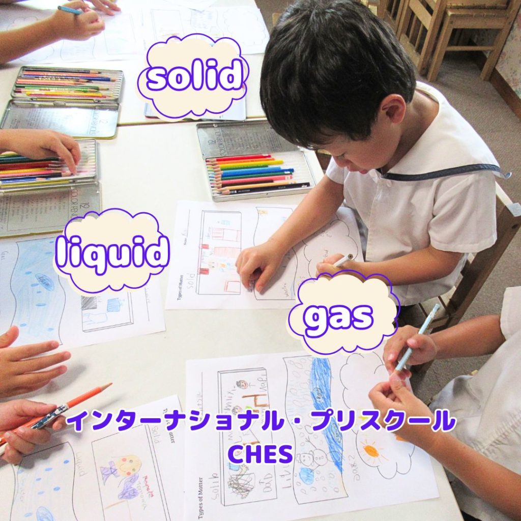 9月になり「プリ・クラス」のTopicが「地球」になりました。8月のプラネタリウム見学の際、「地球」と惑星、銀河についての壮大な話題については、すでにみんなで確認済み。この日はもう少し身近なところに視線を移し、「地球」を構成している「matter(物質)」が話題になりました。