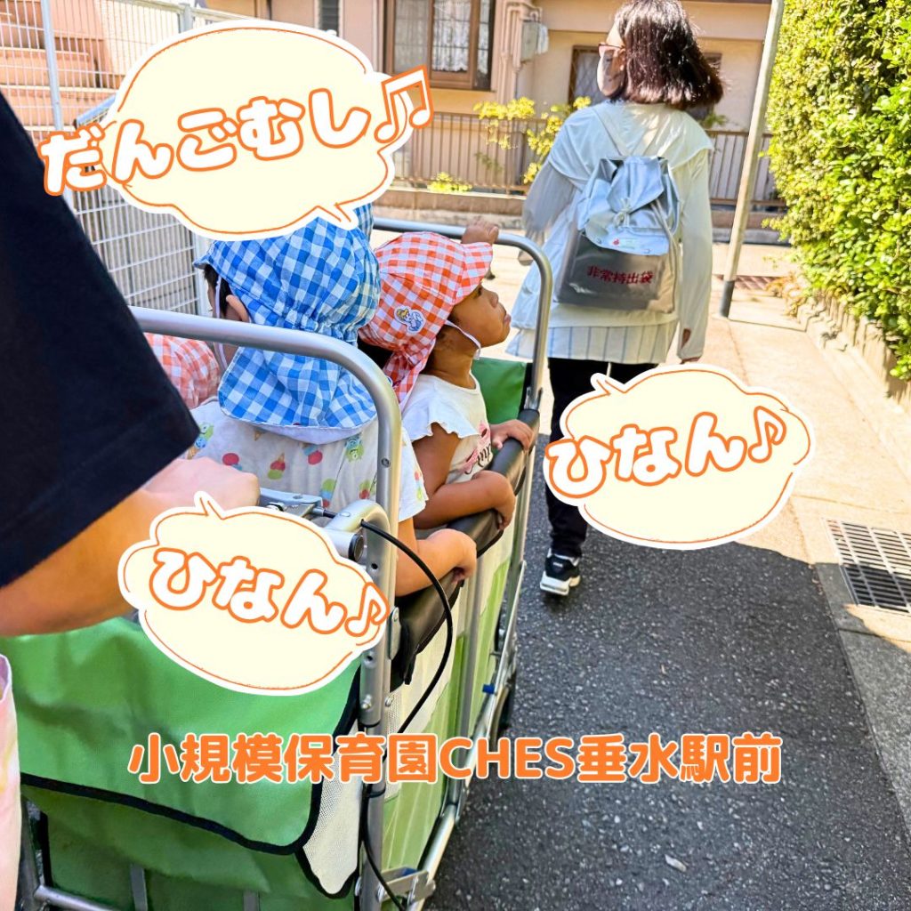 小規模保育園CHES垂水駅前では、いつ自然災害が起きてもいいように毎月避難訓練を行っています。9月は、関東大震災にちなんで制定された「防災の日」に地震を想定した避難訓練を行いました。